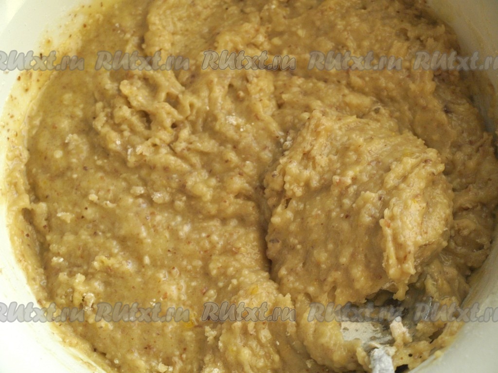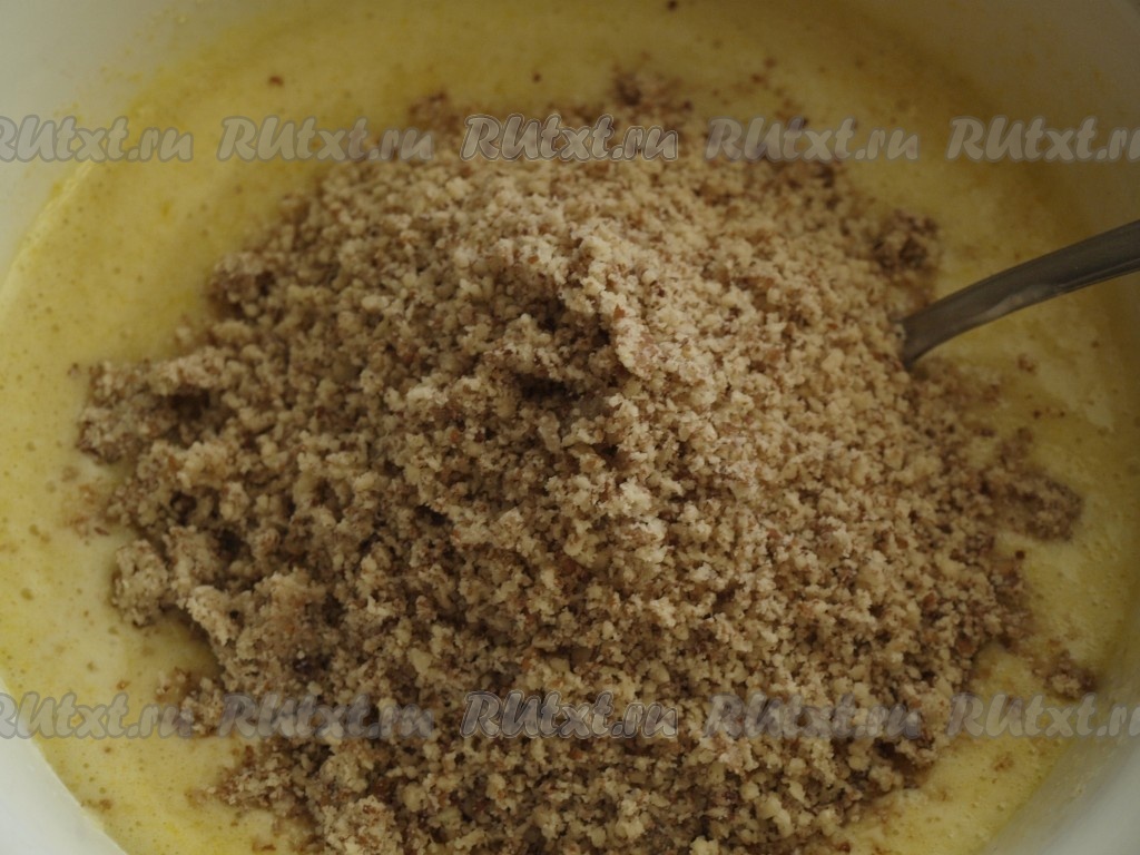 150 грамм грецких орехов перемалываем в крошку и добавляем к смеси сметаны и яиц, перемешиваем.