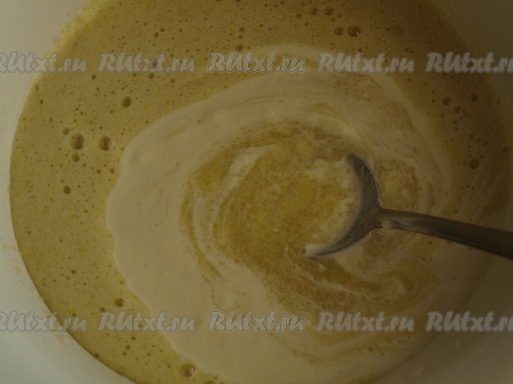 Растираем яйца с 1 стаканом сахара добела. К полученной массе добавляем сметану, перемешиваем ложкой.