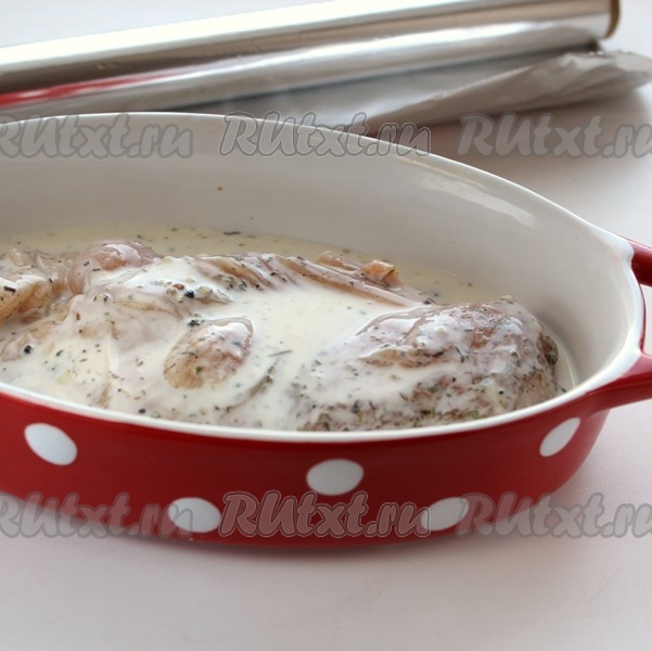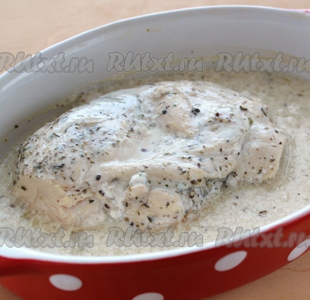 Через 20 минут форму достать из духовки и оставить куриное филе остывать в соусе из кефира, в котором мясо запекалось.