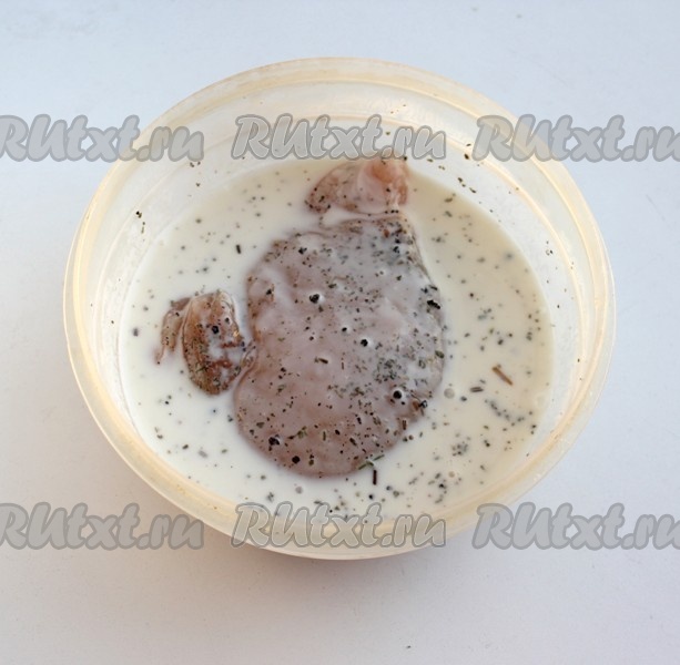 Филе посолить, поперчить, посыпать специями (я посыпала прованскими травами), добавить кефир (мясо должно быть полностью покрыто кефиром) и оставить мариноваться на 15-20 минут. Но чем дольше куриное филе проведёт в кефире, тем нежнее получится мясо. Можно предварительно оставить мариноваться мясо в холодильнике на ночь.