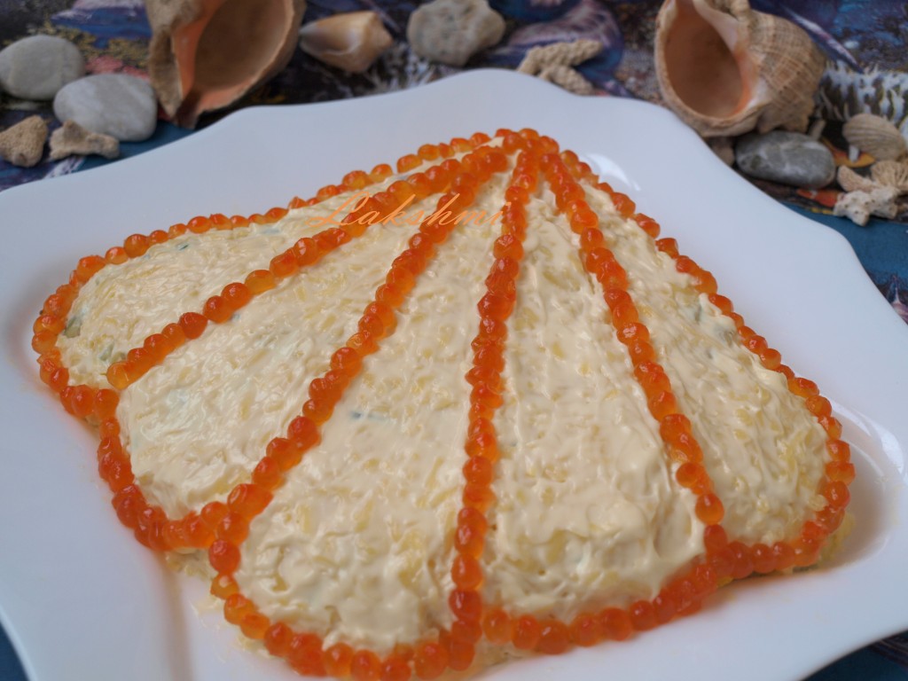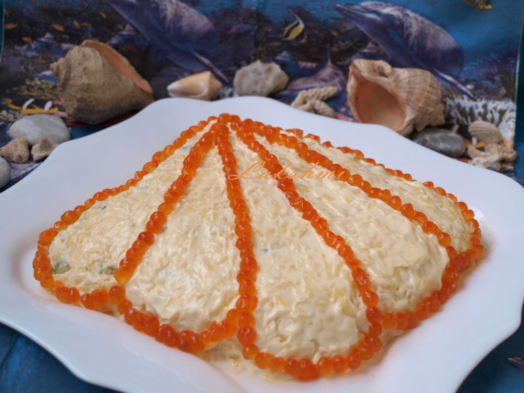 Салат с тунцом, рисом и яйцами украсить красной икрой. Салат "Морская ракушка" готовится просто, а выглядит очень эффектно.