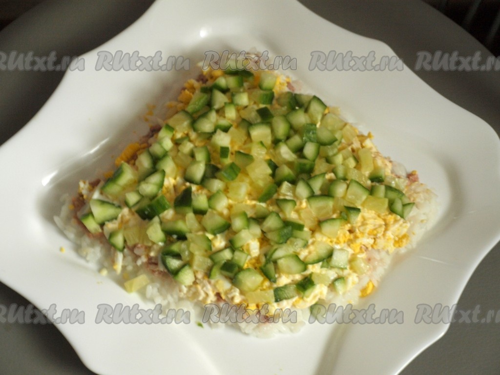 Свежий огурчик нарезать кубиками, выложить на яйца и смазать майонезом.