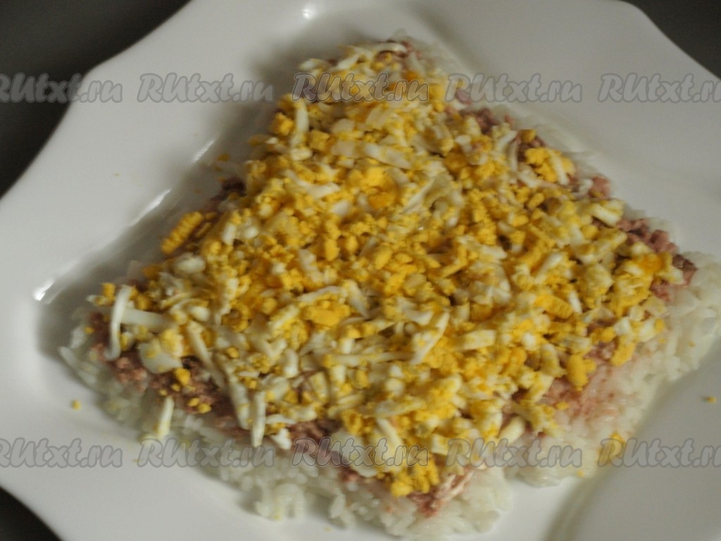 Яйца, сваренные вкрутую, натереть на крупной тёрке и выложить следующим слоем, смазать майонезом.