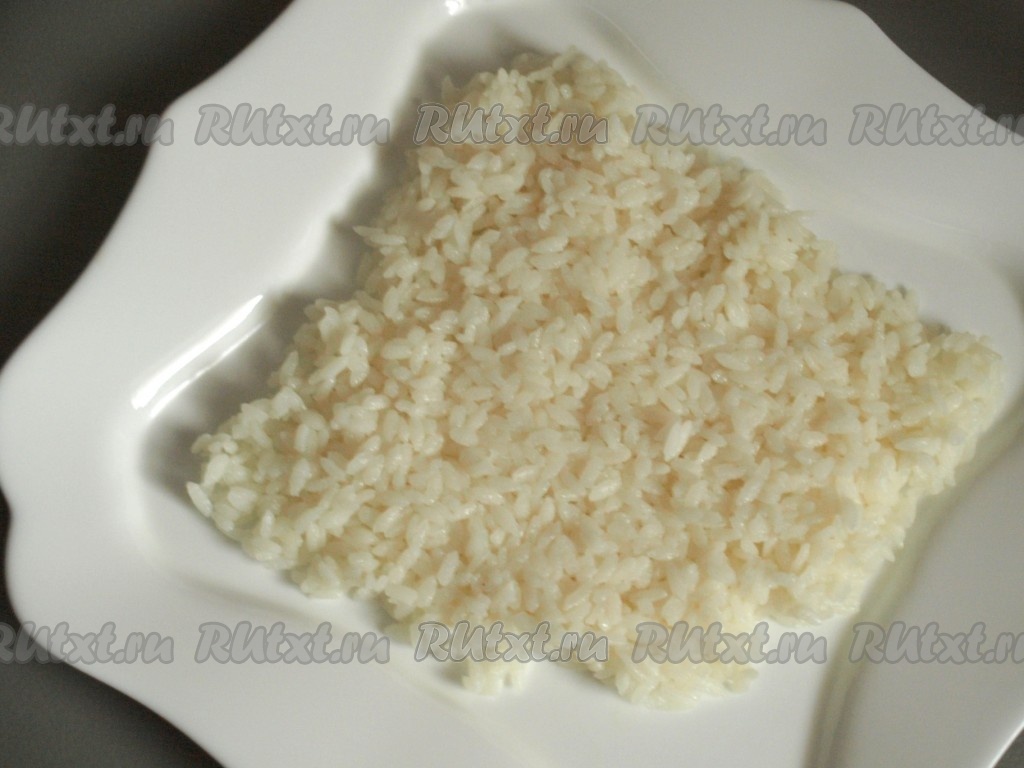 Рис отварить до готовности и выложить на блюдо в виде морской раковины.