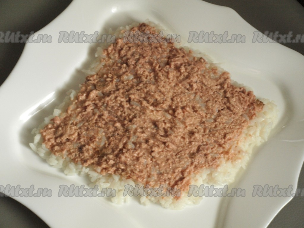 Тунца (без жидкости) размять вилкой и выложить поверх риса.