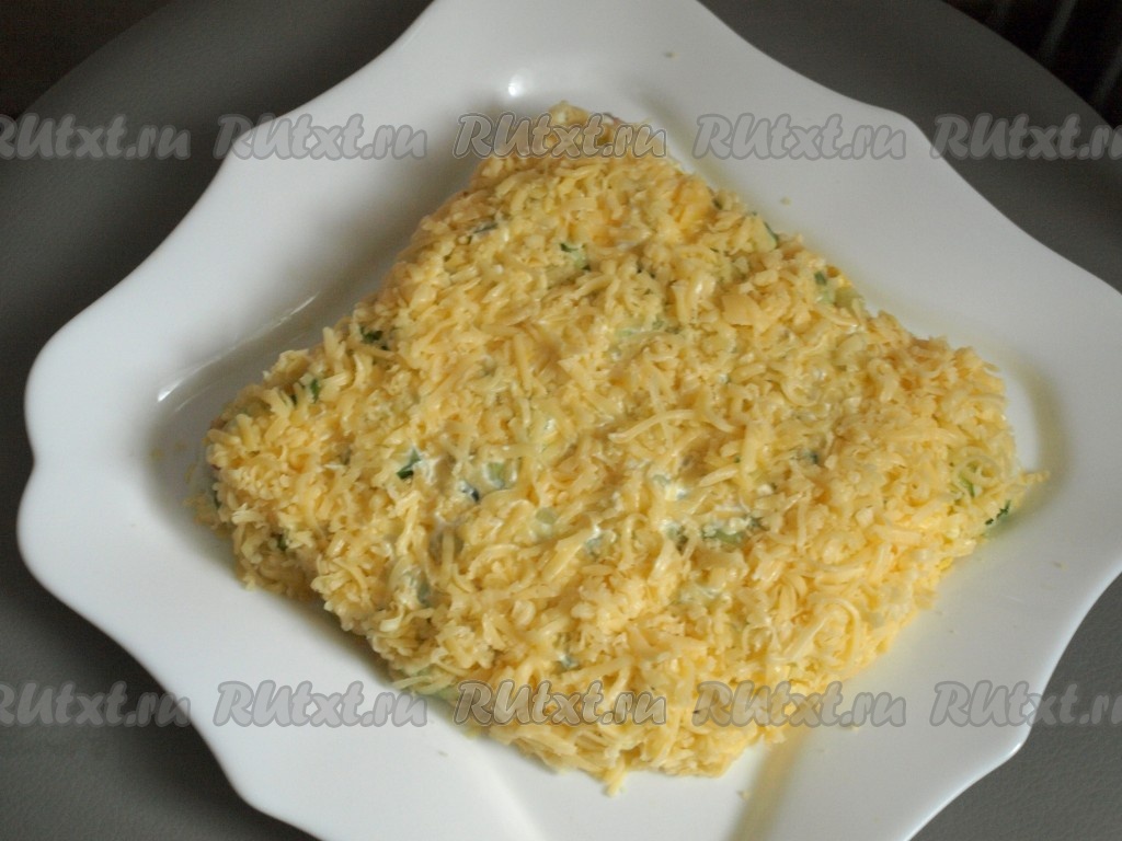 Слой огурцов посыпать сыром, натёртым на тёрке, и смазать майонезом.