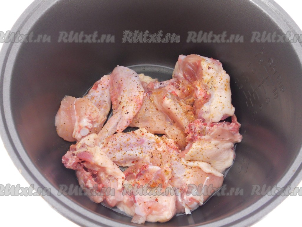 Курицу помыть, обсушить, порезать и выложить в чашу мультиварки. Посолить, посыпать специями. Влить растительное масло.
