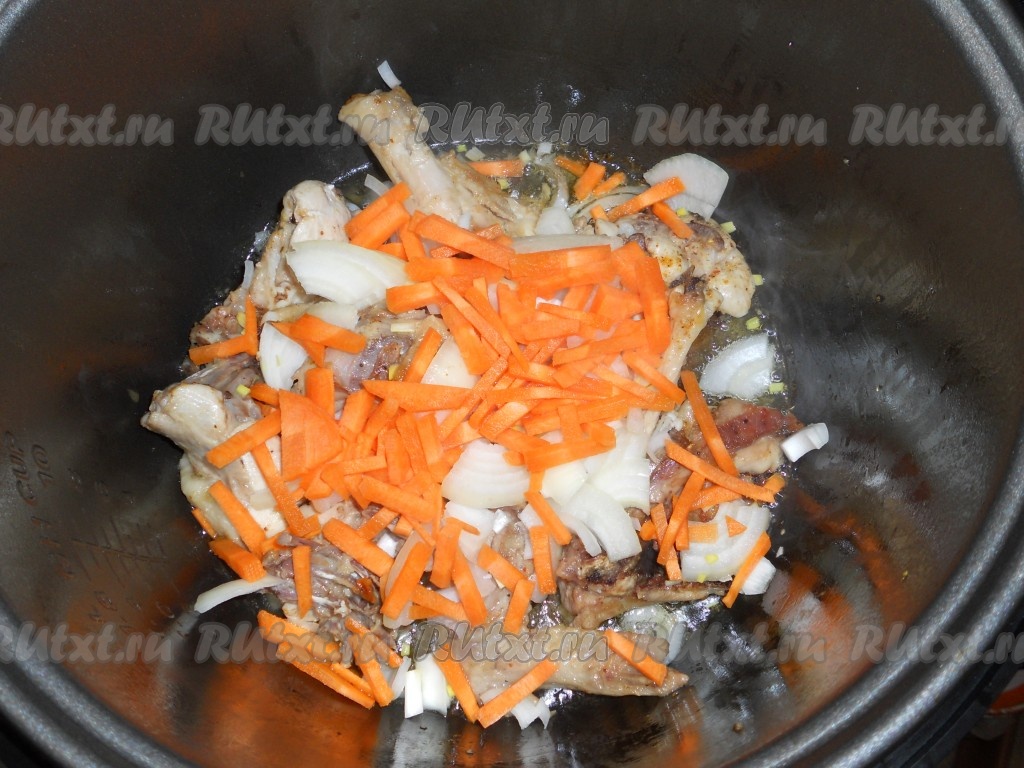 Выставить режим мультиварки "Выпечка" или "Жарка" на 10 минут. Затем добавить порезанный кусочками лук и морковь, нарезанную брусочками. Готовить на том же режиме еще 10 минут.