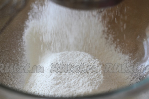 Добавляем соду, погашенную уксусом, взбиваем. Просеиваем муку и постепенно добавляем в яично-кефирную смесь.