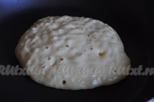 Далее разогреваем сковороду и с помощью столовой ложки наливаем тесто.