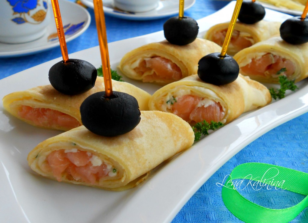 Далее, острым ножом, наискось порезать вкуснейшие блинчики с семгой и сыром на кусочки, выложить на блюдо. Сверху на каждый кусочек поместить по оливке, зафиксировав ее шпажкой.