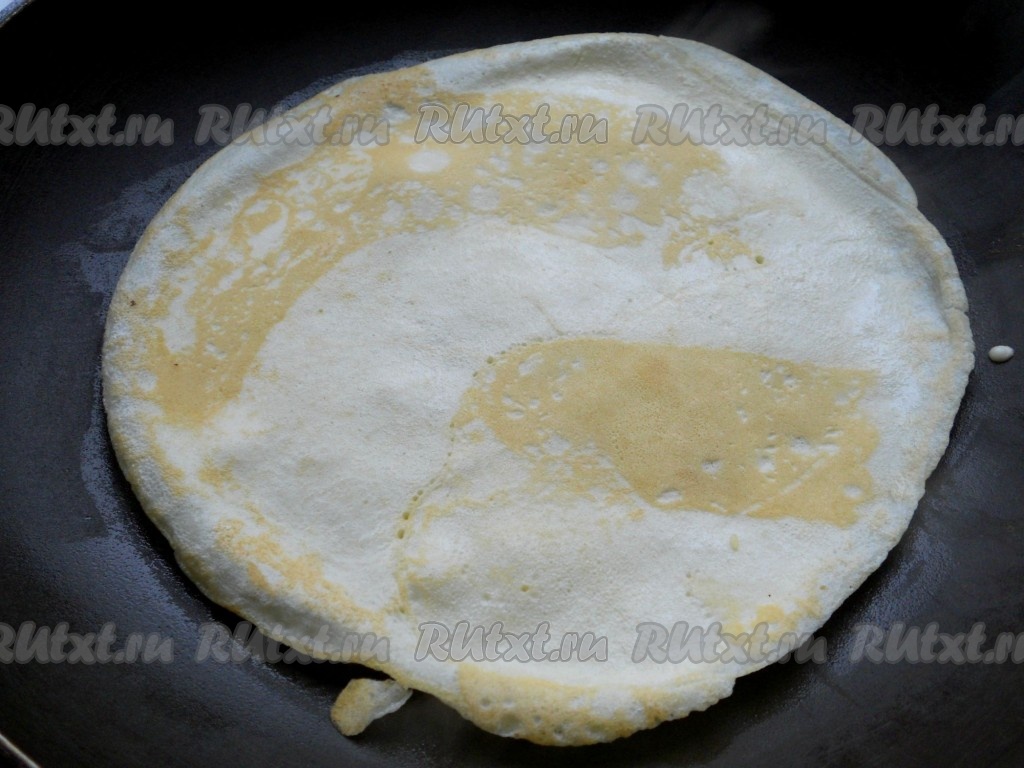 Жарить блинчики обычным способом с двух сторон до золотистого цвета на раскаленном растительном масле.