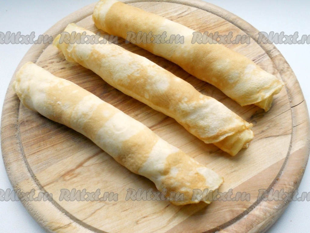 Свернуть блинчики трубочкой. Поместить в холодильник минут на 15.