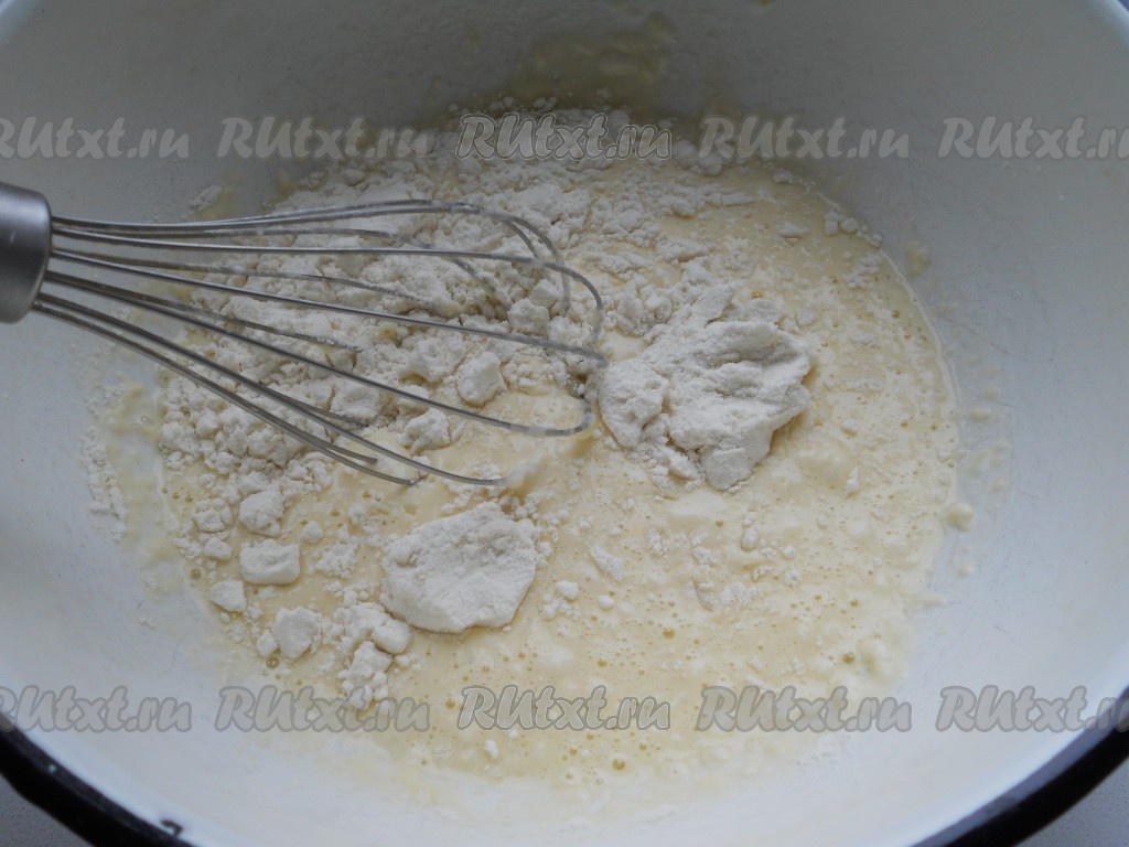 Перемешать все, добавить соль, сахар, соду, гашеную лимонным соком, и просеянную муку. Хорошо взбить венчиком. Тесто должно быть и не слишком жидким, и не слишком густым.