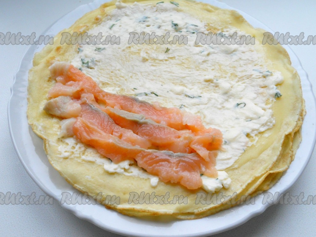 Смазать блинчики подготовленным сыром. На одну половину блинчика выложить кусочки семги.