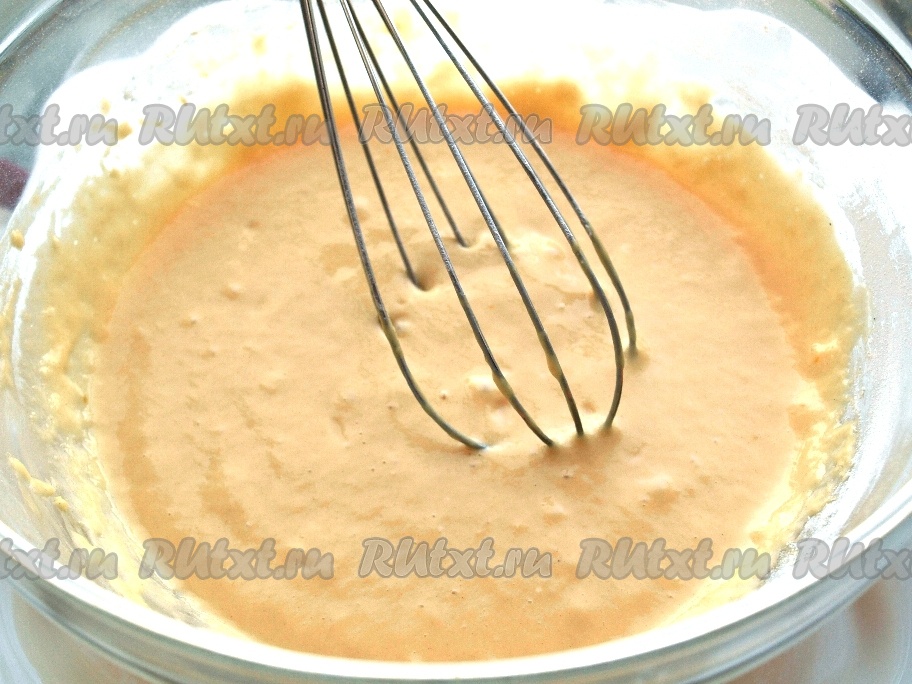 Постепенно добавляем муку, смешанную с разрыхлителем, и перемешиваем. Тесто для блинных кружев получится, как густая сметана.