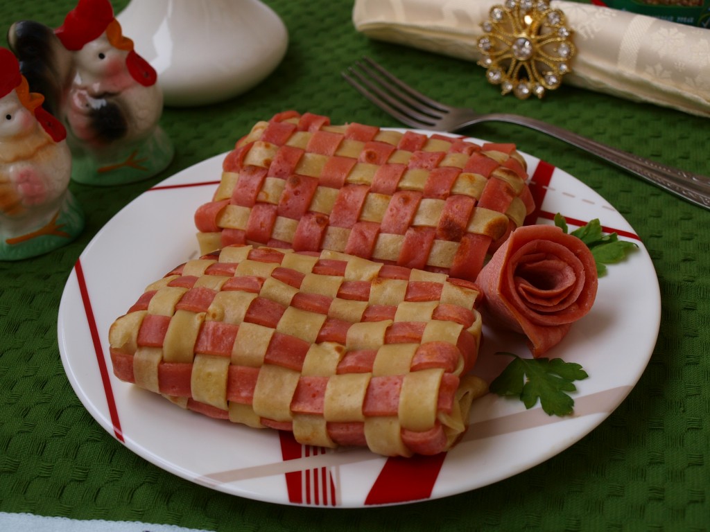 Можно сделать и наоборот: свекольный блинчик разрезать не до конца на полоски, а из белых полосок делать плетение. Плетение - кропотливая работа, но она обязательно будет оценена по достоинству!