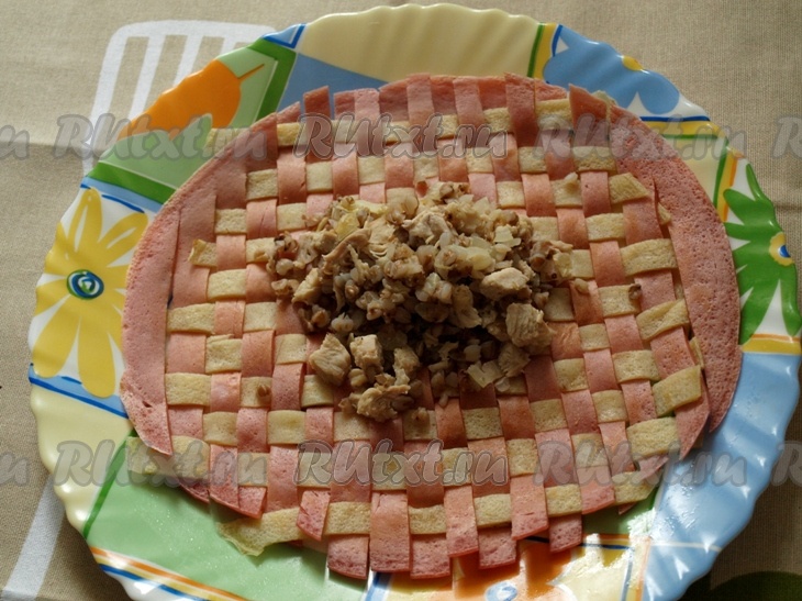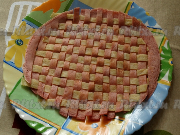 Свекольный блинчик разрезаем на полоски и начинаем плетение: через одну поднимаем белые полоски и выкладываем розовую полоску. Следующий ряд плетём в шахматном порядке. Так продолжаем плести ряд за рядом.