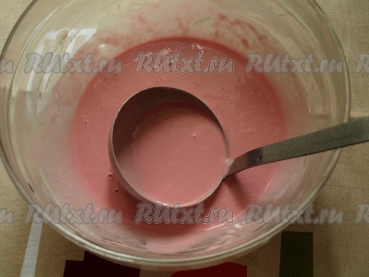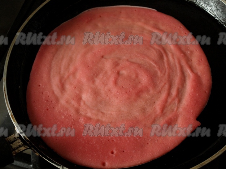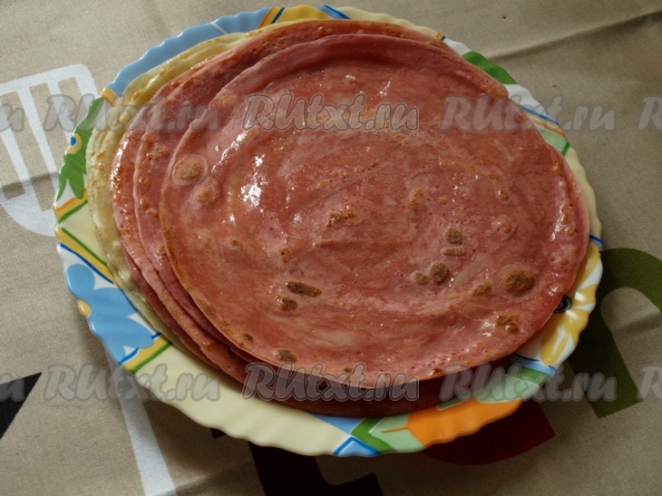 К яйцу, взбитому с солью и сахаром, добавляем воду и молоко. Хорошо перемешиваем и начинаем постепенно добавлять муку с содой, продолжая перемешивать. Полученную массу хорошо перемешиваем. На разогретой сковороде, смазанной растительным маслом, готовим 4 светлых блина (как обычно, с двух сторон). В оставшееся тесто добавляем свекольный сок (можно взять или свежевыжатый свекольный сок, или сок, выжатый из варёной свеклы) и хорошо перемешиваем.