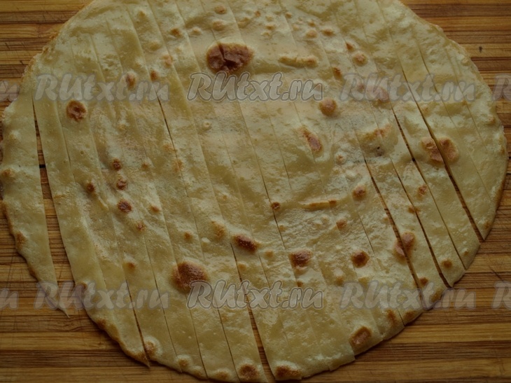 Блин (например, светлый) разрезаем не до конца на полоски шириной по 0,7 см.