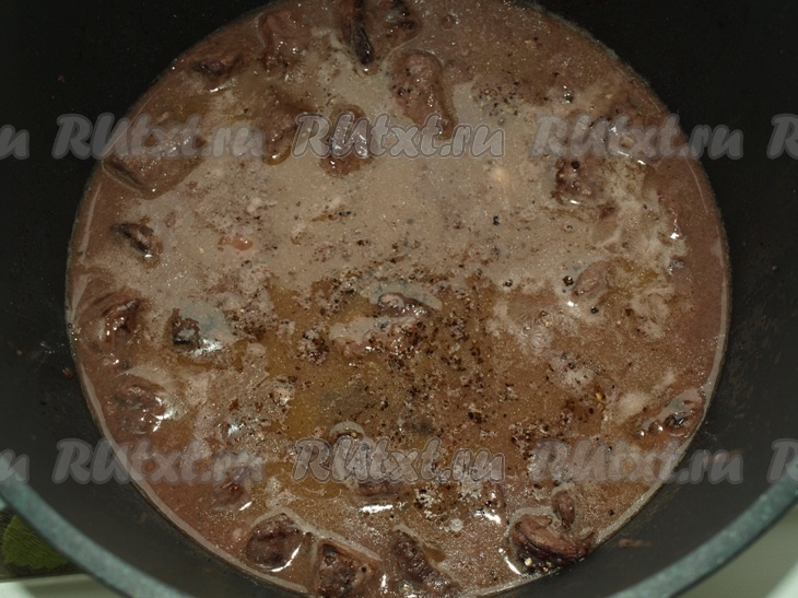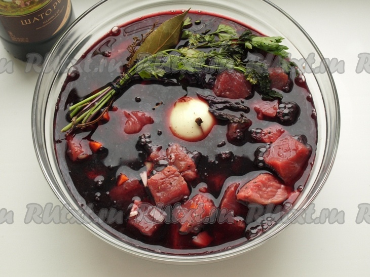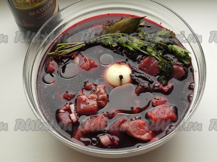 Растапливаем в сковороде 20 грамм сливочного масла, добавляем жир, оставшийся от жарки мяса, 1 столовую ложку муки и тщательно перемешиваем. Процеженный маринад доводим до кипения, добавляем в него зажарку из муки, перемешиваем и переливаем в кастрюлю с говядиной. Солим, перчим, закрываем кастрюлю крышкой и тушим 1,5 часа на медленном огне говядину в вине.