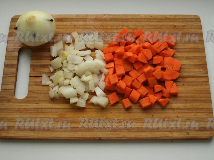 Для приготовления маринада кубиком нарезаем одну репчатую луковицу и морковь. Во вторую репчатую луковицу, сделав надрезы, вставляем гвоздику (в оригинальном рецепте нужен лук-шалот, но я обошлась репчатым).