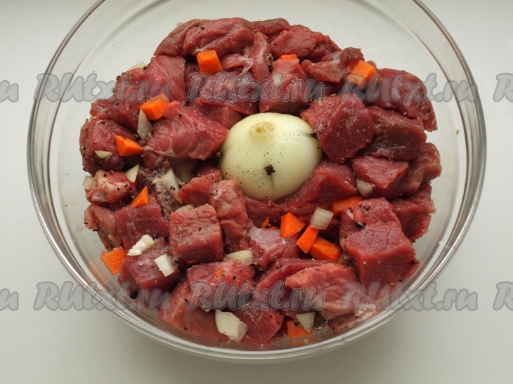 Порезанное мясо, лук и морковь кладём в стеклянную (или керамическую) посуду, посыпаем толчёным чёрным перцем.