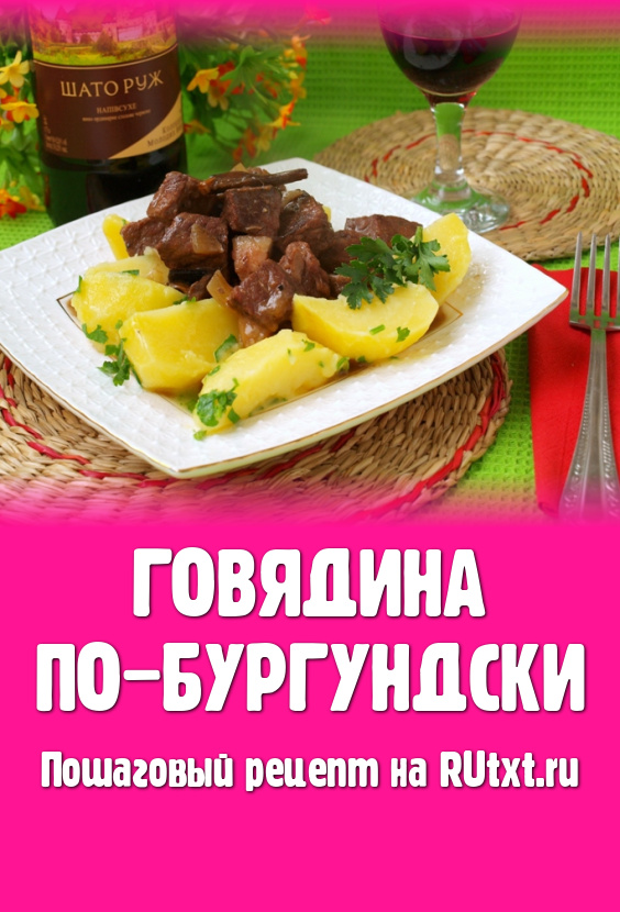 Говядина по-бургундски - вкусное и ароматное блюдо французской кухни. Существует немало вариантов его приготовления. Этот рецепт из книги Жерара Депардье "Моя кухня". В классическом рецепте говядины по-бургундски рекомендуется использовать хорошее бургундское вино, но у нас такое не купить, да стоит оно, наверно, совсем недёшево. Я использовала красное полусухое вино, получилось очень вкусно!