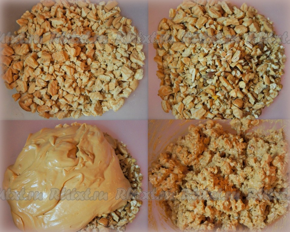 Орехи порубить ножом, подсушить на сухой сковороде в течение 2-3 минут при постоянном помешивании. Остудить. К печенью добавить измельченные орехи, крем и тщательно перемешать полученную массу.