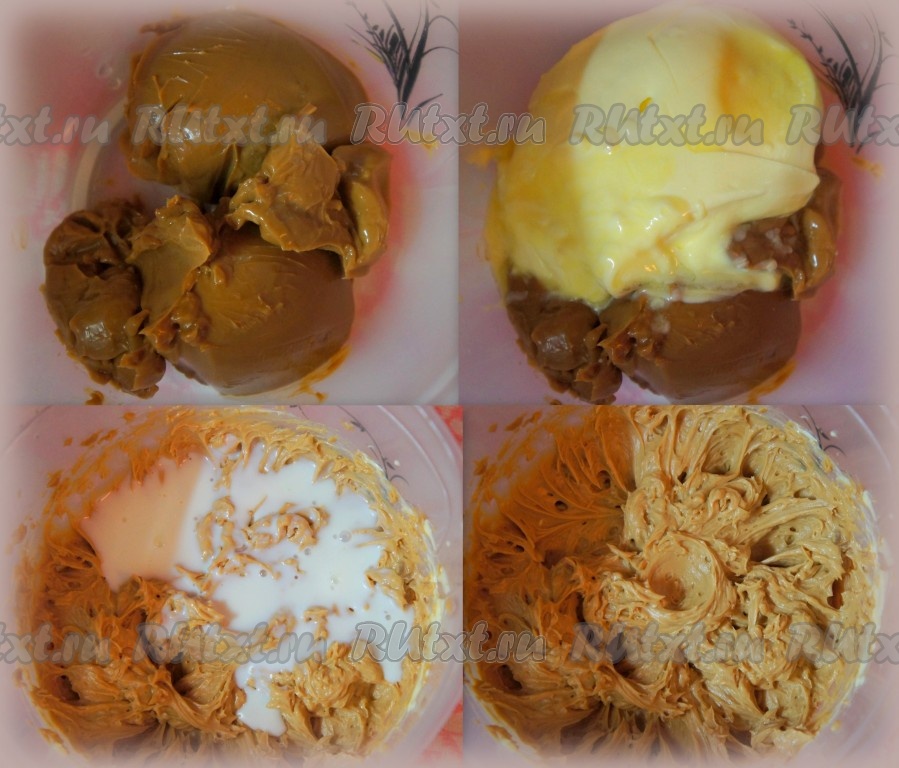 Приготовим крем. В глубокую ёмкость добавить варёное сгущенное молоко, размягченное сливочное масло комнатной температуры, взбить 1 минуту, добавить холодное молоко и взбивать ещё около 2-3 минут. Крем для пирожных "Муравейник" готов.