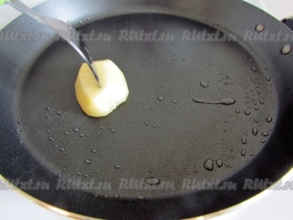 Сковороду хорошо разогрейте и смажьте растительным маслом. Смазывать сковороду удобно с помощью сырой очищенной картофелины.
