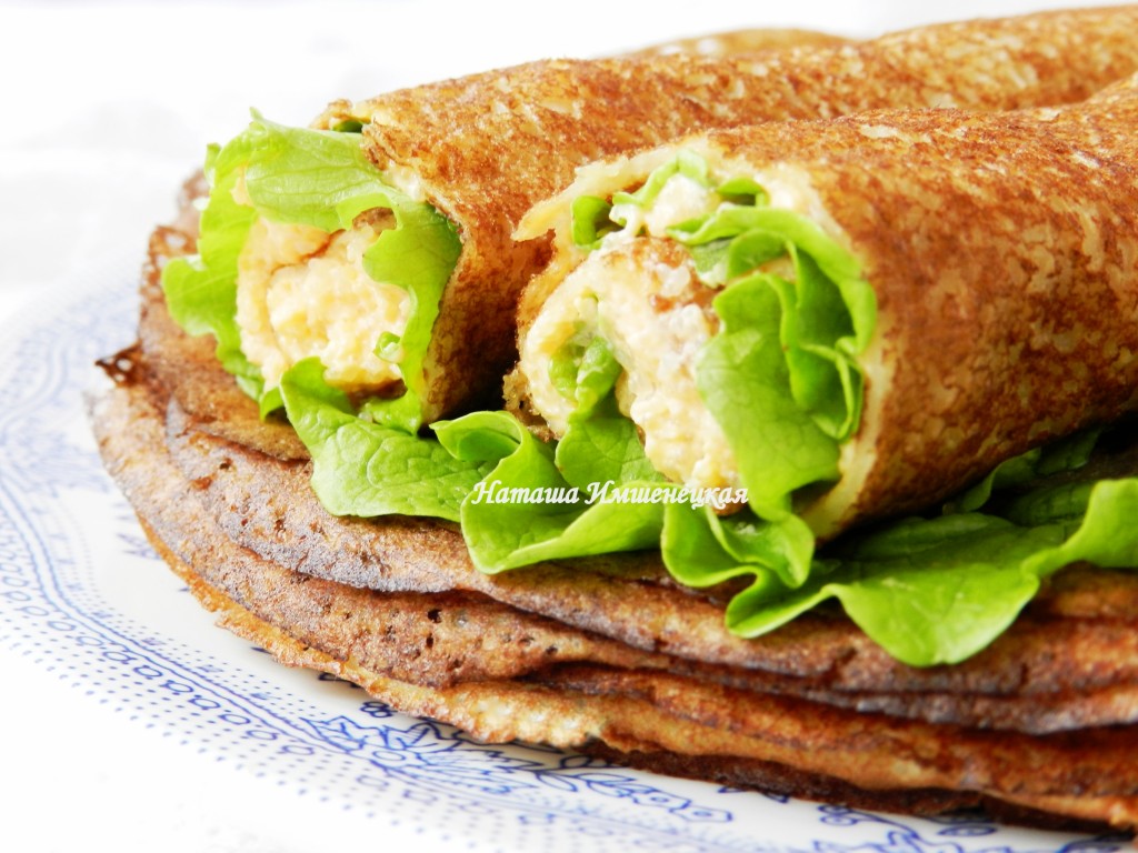Выложить по 1-2 листика салата и свернуть блин рулетом.