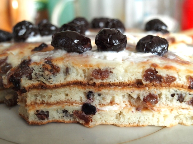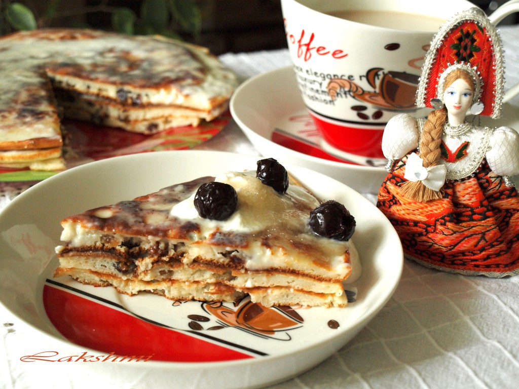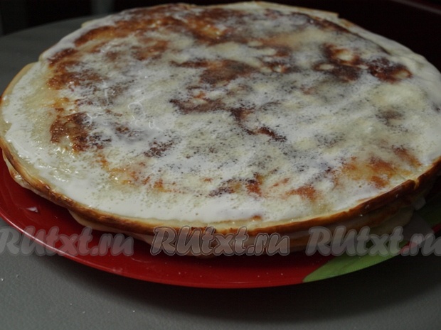 Аналогично выпекаем оставшиеся блины, я их тоже промазываю смесью сметаны с сахаром и складываю блинчики друг на друга. Можно их просто подать со сгущёнкой или мёдом.