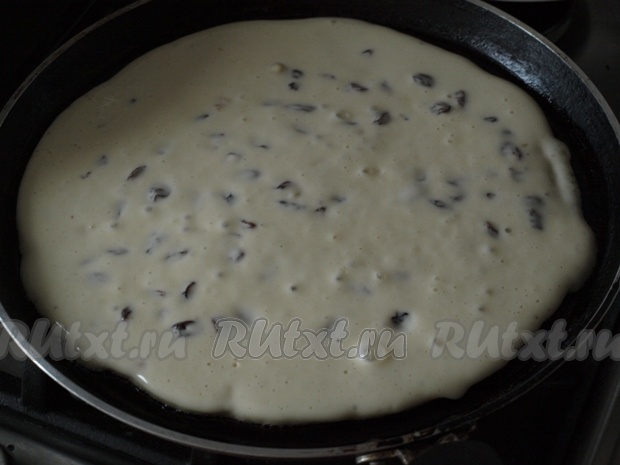 Из этого количества теста, в зависимости от размера сковороды, получится два или три толстых блина. У меня получилось 3 блина диаметром 23 сантиметра. Приблизительно делим тесто на порции. На хорошо разогретую сковороду, смазанную растительным маслом, наливаем первую часть теста. Равномерно распределяем по всей поверхности сковороды, огонь уменьшаем и готовим блин, пока нижняя часть хорошо не схватится (тесто перестанет быть жидким).