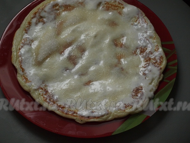Горячий блин перекладываем на тарелку. Я предпочитаю горячий блинчик сразу смазывать сметаной, смешанной с сахаром.