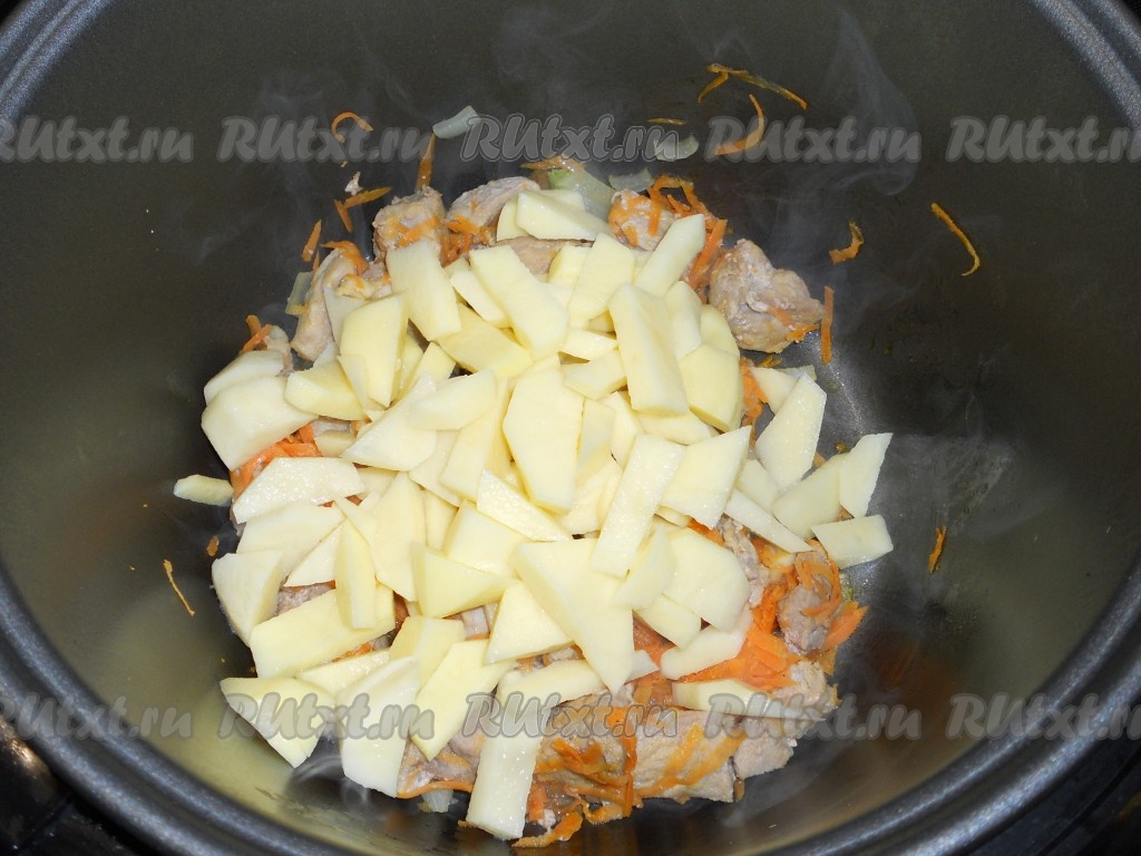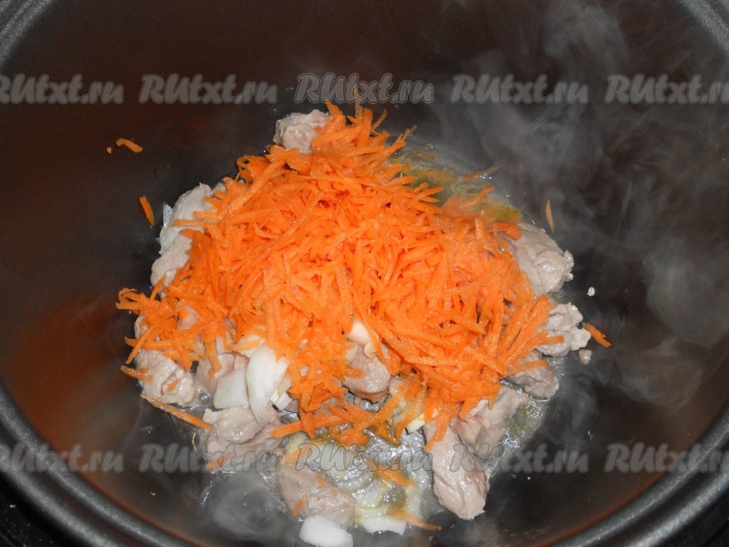 В чашу мультиварки влить подсолнечное масло, выложить мясо. Выставить режим "Жарка" на 10 минут. Затем добавить порезанный репчатый лук и натертую на крупной терке морковь. Готовить на том же режиме еще 10 минут.