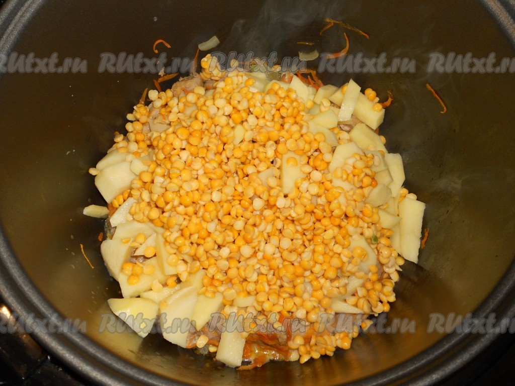 Также всыпать промытый горох (предварительно замачивать не нужно).