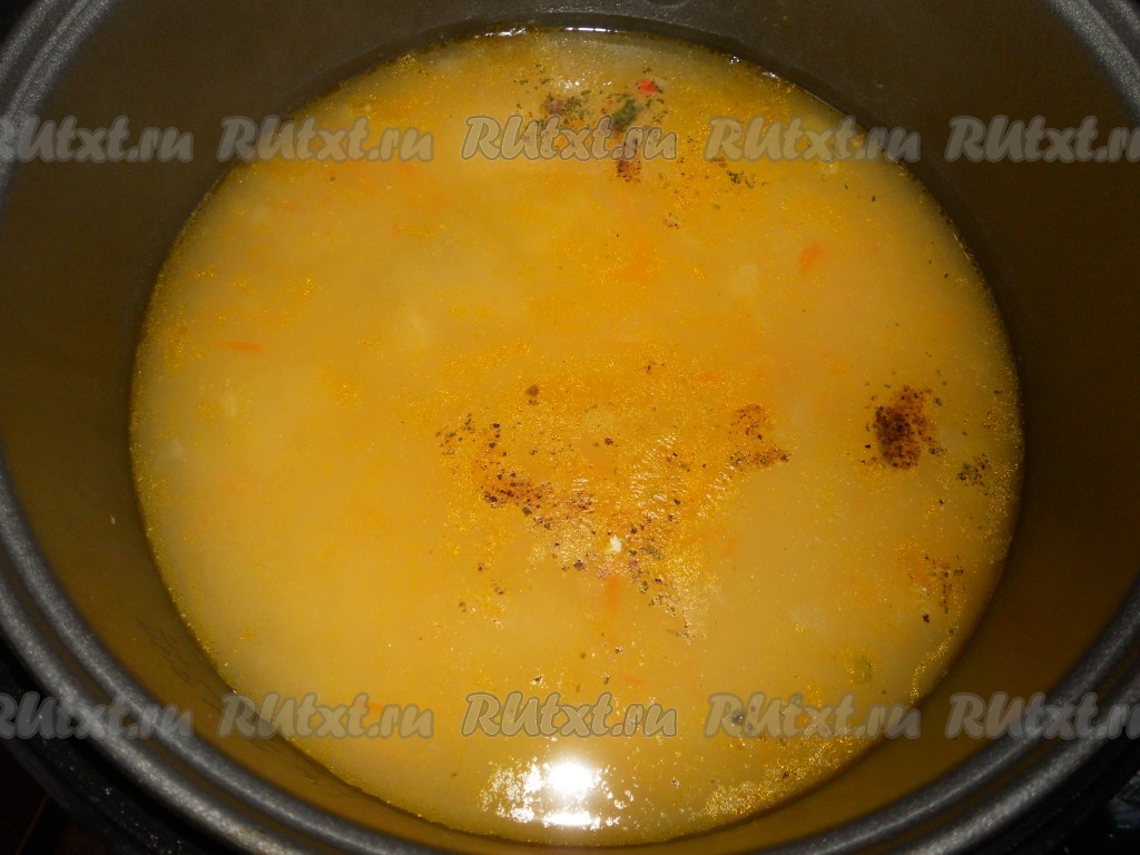 Влить горячую воду. Выставить режим мультиварки "Тушение" на 2 часа. За 10 минут до готовности добавить в суп соль, черный молотый перец и лавровый лист.