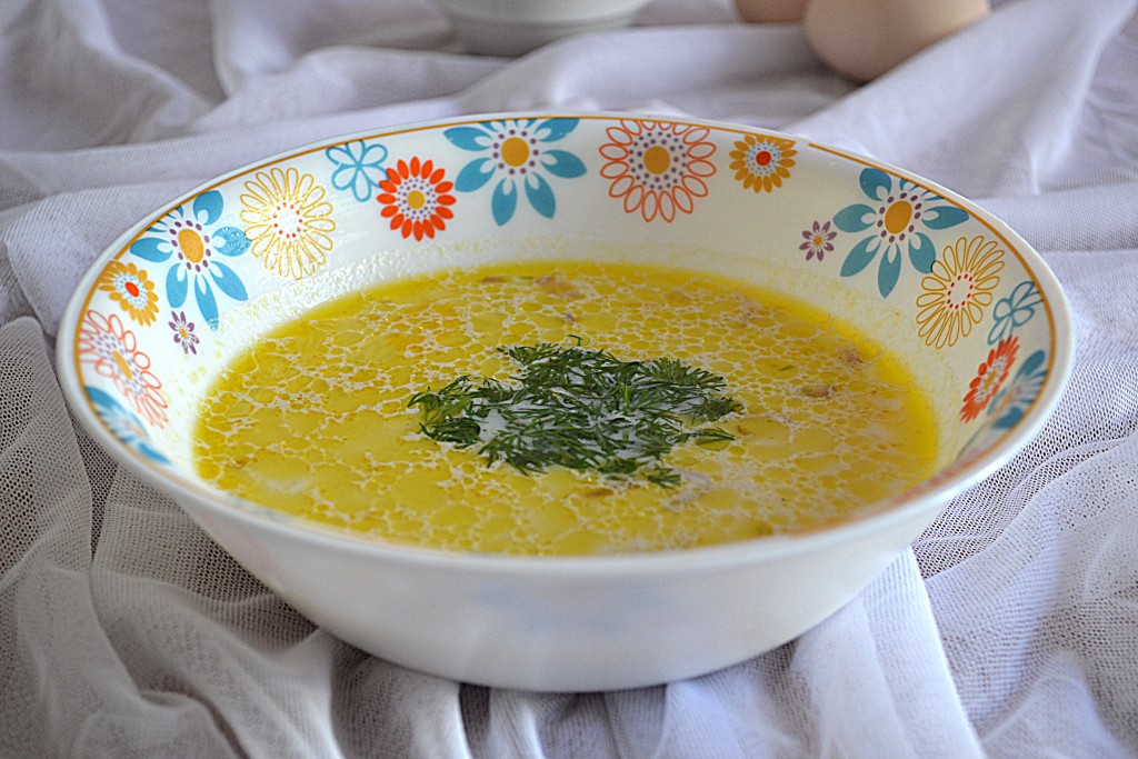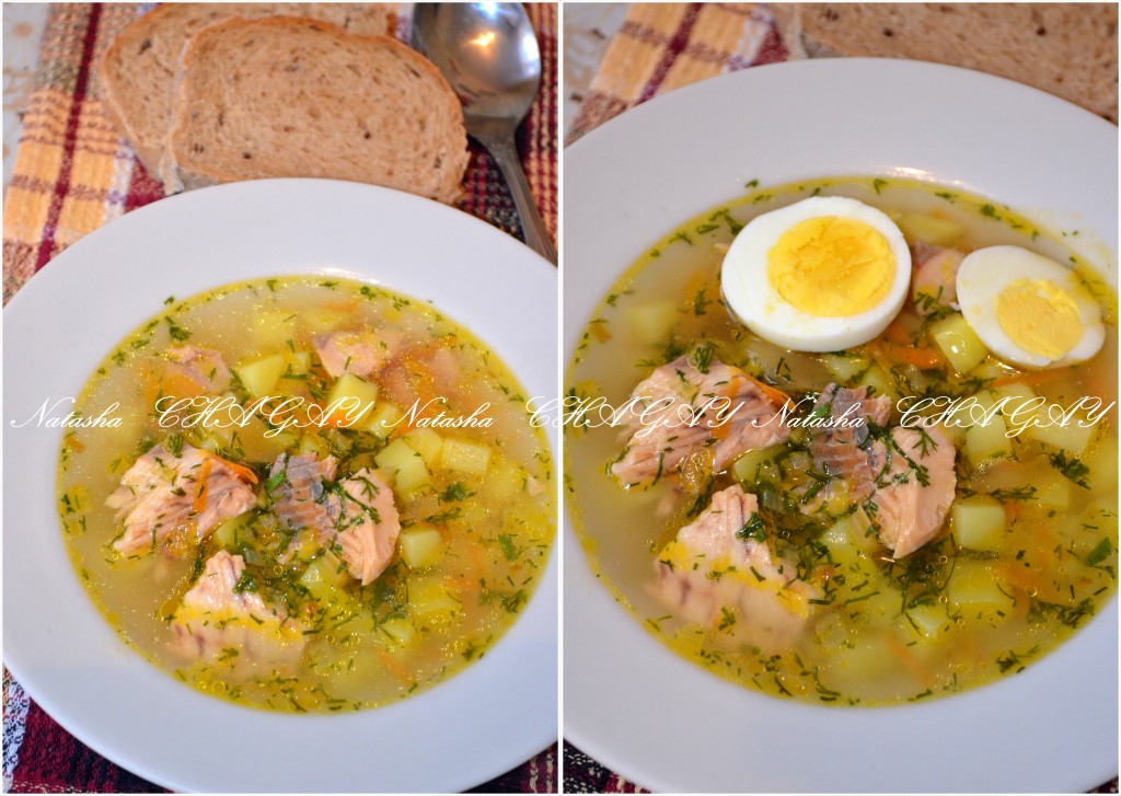 Очень вкусно суп из консервированного лосося подавать с вареным яйцом и обязательно с зеленью.