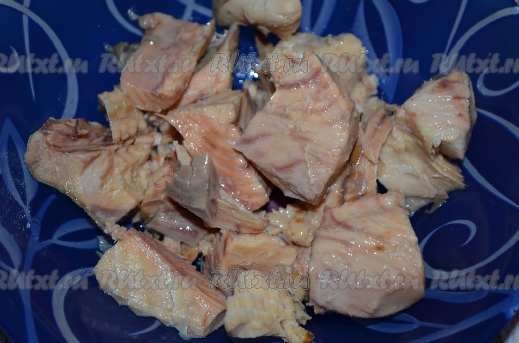 Консервированного лосося освободить от костей. Разобрать на небольшие кусочки.
