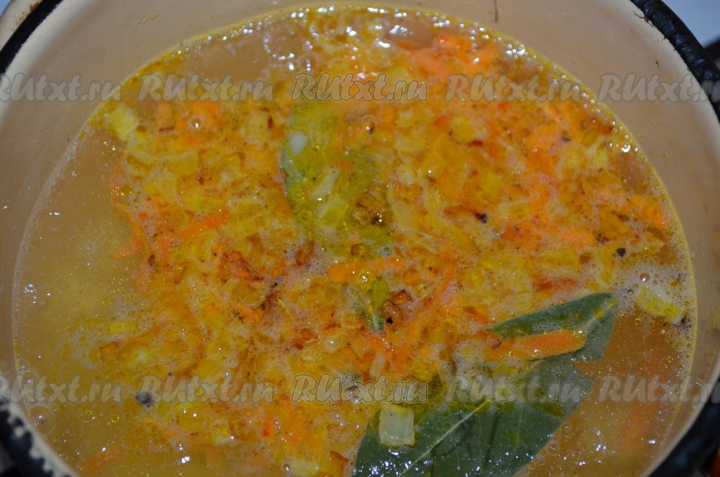 Добавить в суп поджарку, перец горошком и лавровый лист.