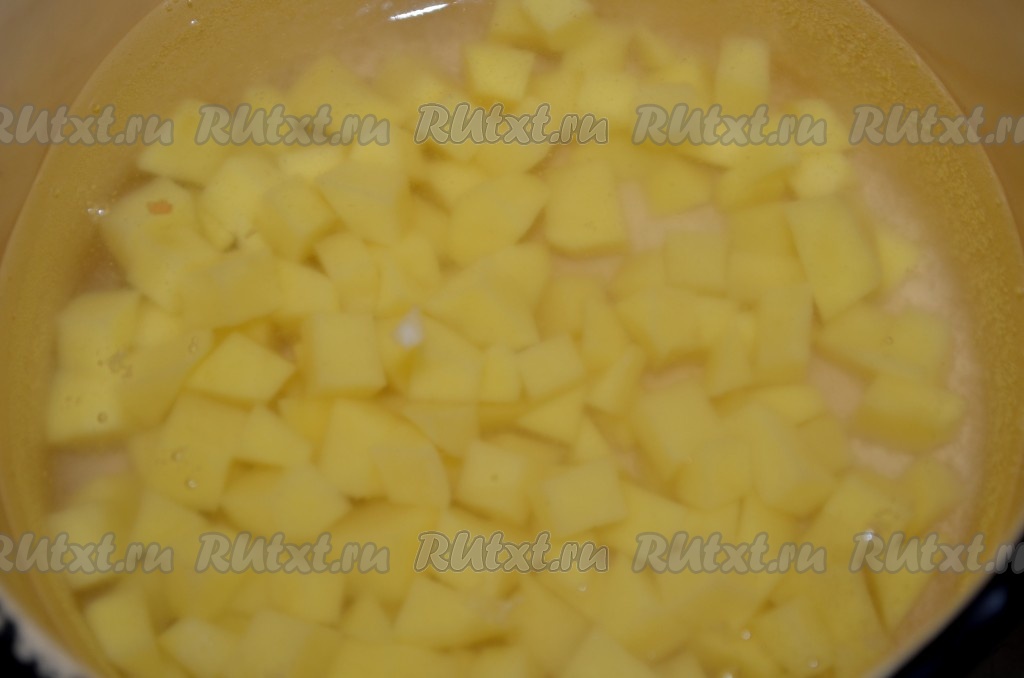 Воду вскипятить. Опустить туда порезанный картофель, посолить немного. Варить почти до готовности.