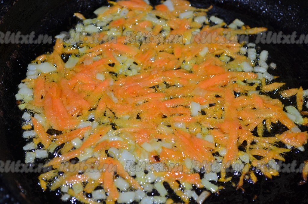 Морковь натереть на тёрке, лук порезать кубиком, обжарить не небольшом количестве масла.