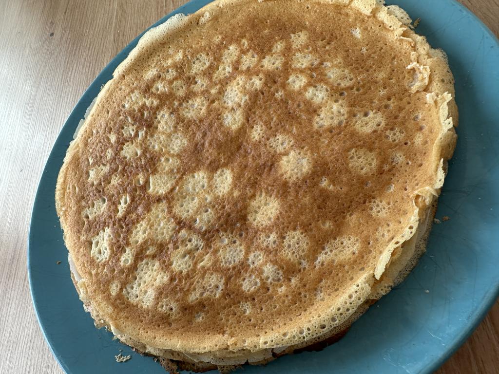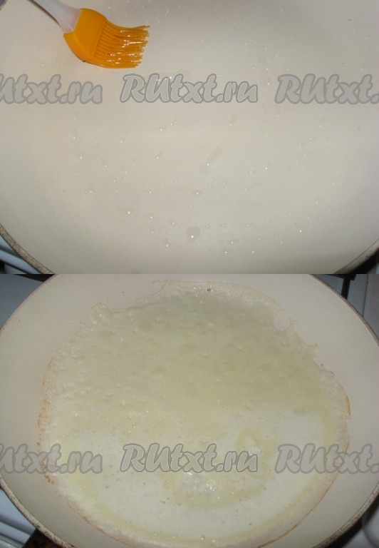 А пока разогреть сковороду, смазанную растительным маслом (не надо лить масло, достаточно смазать кулинарной кисточкой, а если сковорода с хорошим антипригарным покрытием, последующие блинчики вообще печь без масла!). Тесто налить тонким, равномерным слоем на сковороду.