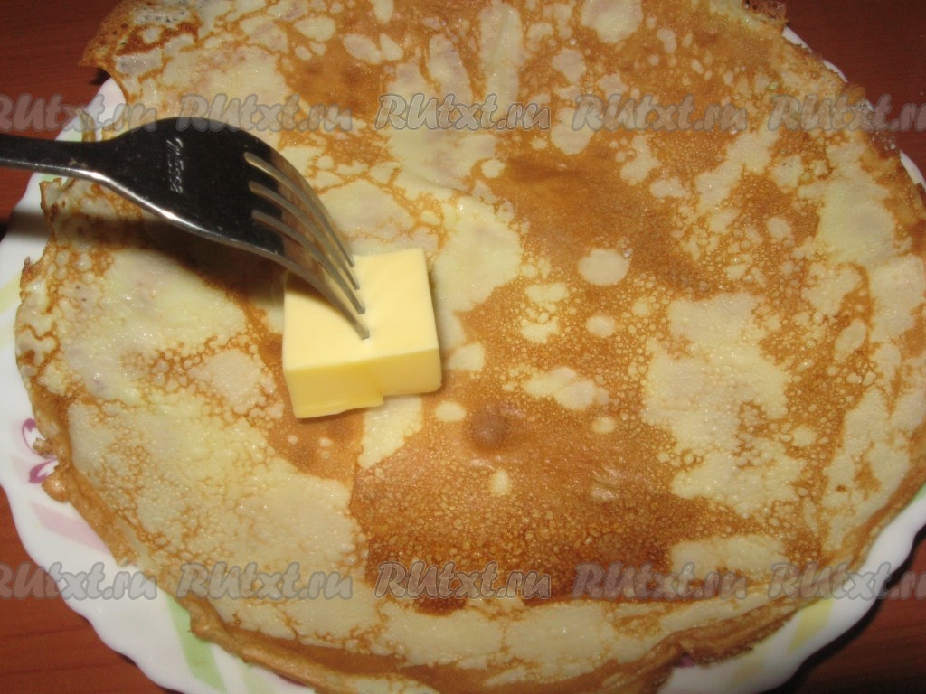 Блинчики выкладывать на тарелку, смазывая сливочным маслом.