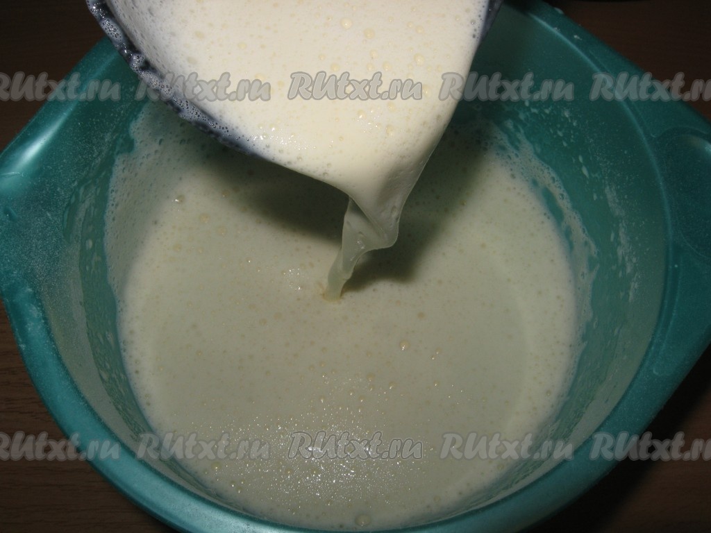 Влить остатки молока, перемешать, должно получится полугустое, я бы даже сказала жидкое тесто - оно должно литься с ложки или черпака. Тесту дать немного постоять.