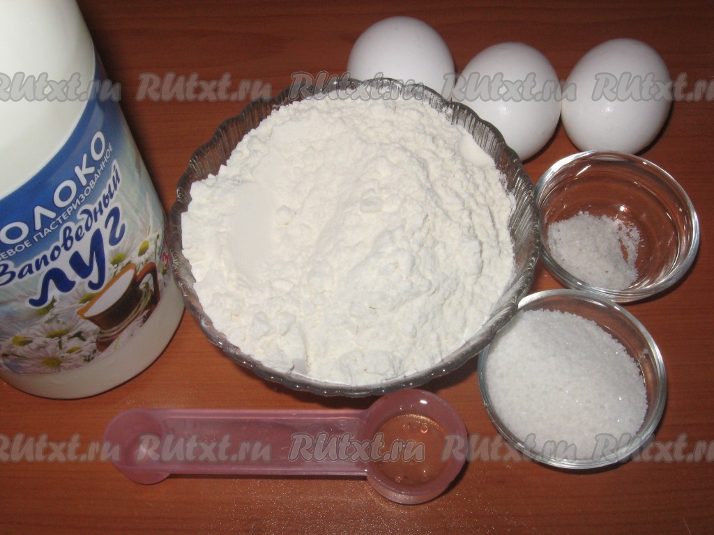 В глубокой широкой миске соединить часть молока, сахар, соль, растительное масло и яйца, все тщательно перемешать венчиком на низкой скорости блендера или обычным ручным венчиком.