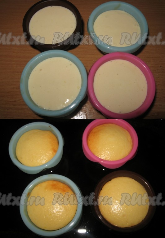 Затем творожно-апельсиновую массу разлить по формочкам (у меня силиконовые для мини кексов), заполняя примерно на 3/4, поставить формочки на противень, заполненный на половину водой. Запекать в заранее разогретой до 190 градусов духовке 30-40 минут, готовность можно определить по слегка золотистому верху и отставанию от стенок.
