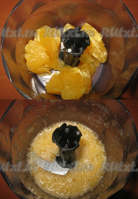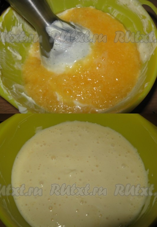 Затем добавить пюре апельсина и снова все пробить блендером. Должна получится полугустая однородная масса, нежно-желтого цвета.