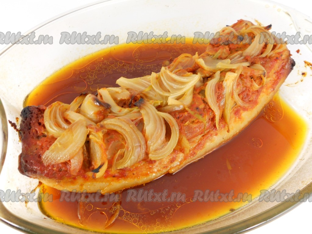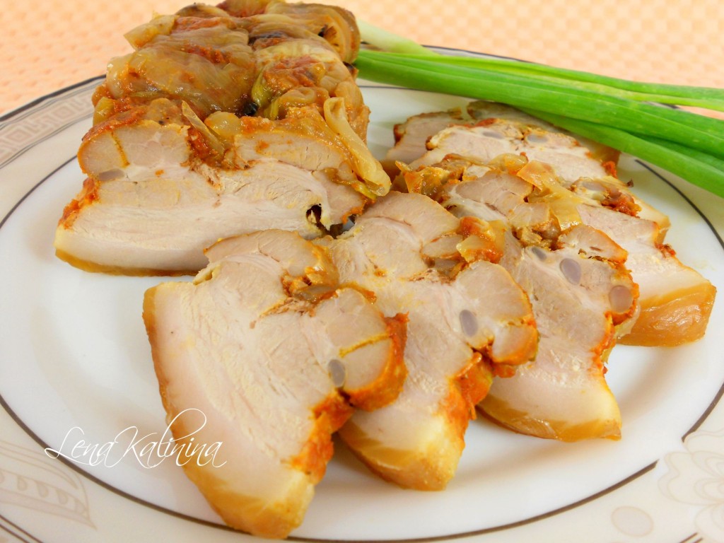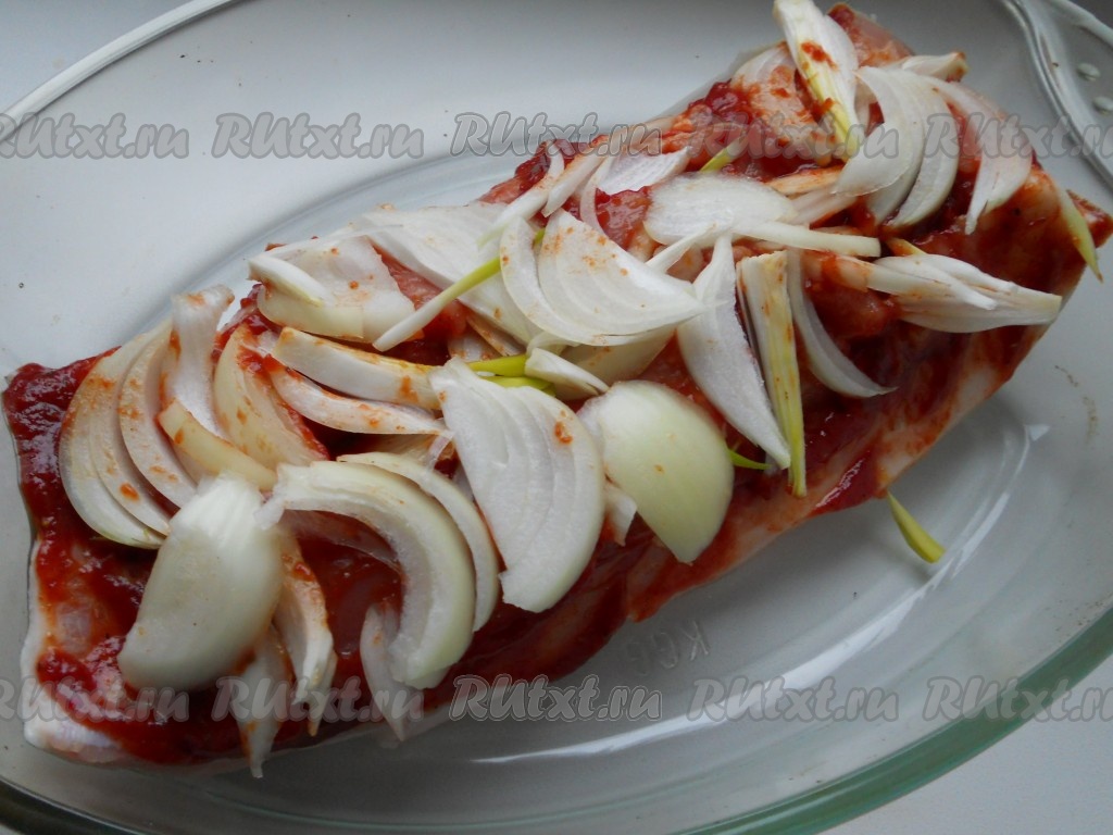 Смазать хорошенько подготовленную свиную грудинку этой смесью со всех сторон. В разрезы разместить нарезанный полукольцами репчатый лук. Оставшийся лук выложить сверху.